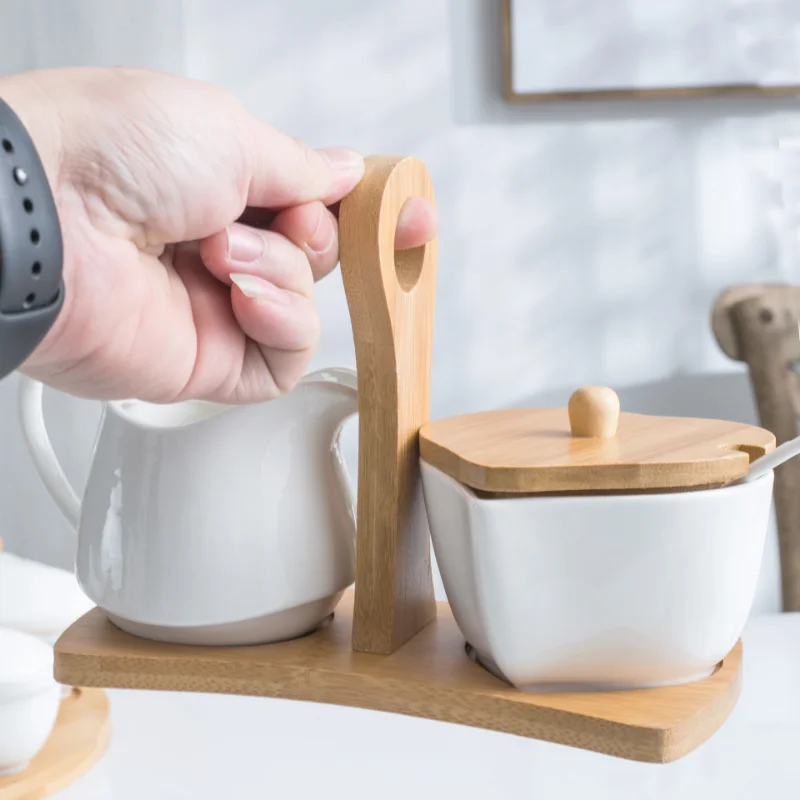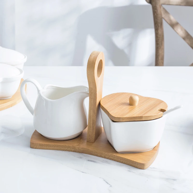 Heart-shaped pure white ceramic sugar bowl milk jug set with bamboo handle