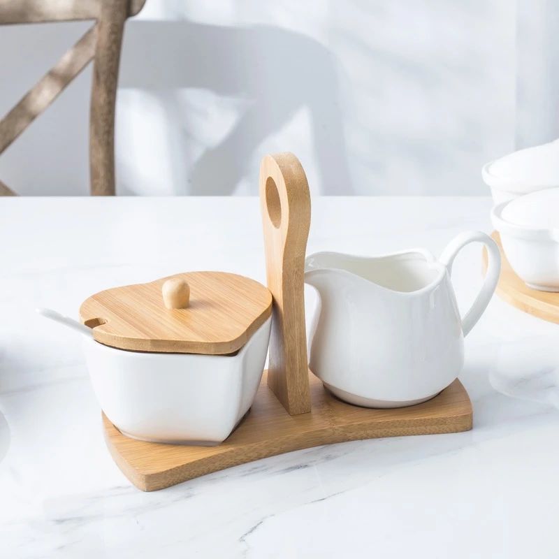 Heart-shaped pure white ceramic sugar bowl milk jug set with bamboo handle